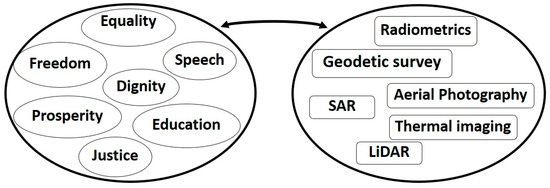 Various remote sensing techniques viz. radiometric, SAR, aerial photography, Light Detection and Ranging (LiDAR), and thermal imaging, etc. play a vital role in various aspects of human rights, such as equality, freedom, education, dignity, prosperity, justice, and speech. Figure 11 depicts the interconnection of remote sensing techniques with the various aspects of human rights. Although remote sensing platforms provide useful data, it can be interpreted differently by different users and algorithms. During a dispute between Nigeria and Cameroon before the International Court of Justice (ICJ), the remote sensing evidence presented before the court had conflicting interpretations [90]. To establish the legitimacy of using satellite data in legal proceedings, it is important to create universal standards for the interpretation and validation of data across different courts worldwide. To date, it has been used on an ad hoc basis by the European Court of Human Rights for the conflict between Russia and Georgia over South Ossetia, the African Commission, and the African Court of Human and People’s Rights in the case of forced evictions in Zimbabwe, and the International Criminal Court in the case of human rights violations in Darfur [91].
