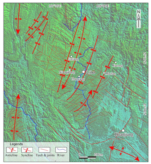Tectonically, Libo cone karst landscape belongs to the slotted fold belt in the southern Yangtze Block. The folds are mainly extending NNE direction. Geological interpretations show that they are composed of gentle synclines and narrow anticlines as shown in Figure 2, which are typical wide-spaced folds. Particularly, the NWW and NNE-striking conjugate joints and faults are also developed well in the Libo area (Figure 2). These folds, faults and joints controlled the spatial distribution of the drainage system in the study area, and the main river flows are mostly parallel with the structural trend, forming the unique landform along the NNE-striking wide-spaced fold belts in Libo [,].