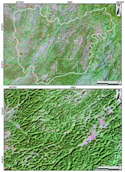 Landsat 8 optical remote sensing image presented in Figure 3a displays the landscapes, vegetation and drainage system in Libo area. Figure 3a shows that Libo landscape is mainly vegetation-covered cone karst, distributed at interval in the EW direction. The most typical vegetation-covered cone karst landscapes are developed in the Maolan site (i.e., the area marked by a white dashed-line rectangle in Figure 3a and the corresponding sub-image presented in Figure 3b). Besides, it also includes some carbonate hilly landforms covered by vegetation (mainly distribute in the northeastern region), as well as bare rocks and urban areas (marked by red dashed-line rectangles in Figure 3a). The Libo cone karst landscape has obviously controlled by the conjugate joints with distinct texture features. Due to the connection of the karst base, they appear as irregular light and dark spots on remote sensing images [], looking like peanut shells as seen on the enlarged remote sensing image (Figure 3b).
