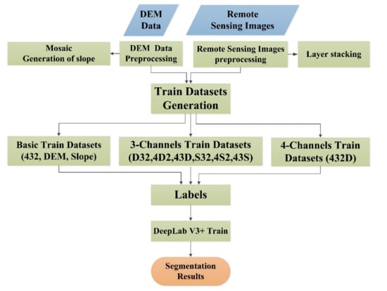 In this study, a segmentation method using both remote sensing and DEM data based on the DeepLab V3+ model was proposed to extract and map the cone karst landscape in Libo. The processing flow of the proposed method is shown in Figure 4.