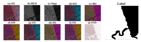 By replacing one of the red, green, and blue channels of the Landsat remote sensing images with the co-registered DEM or slope data, we obtained six sets new three-channel training samples. For instance, by replacing the red channel (NIR band) information in the training sample shown in Figure 5a using the elevation data, a new training sample was generated, which is called D32, as shown in Figure 5d. Similarly, by replacing the green (red band) or blue (green band) channel information in the Landsat images using either the elevation or slope data, more training samples were generated, as shown in Figure 5e–i, respectively.