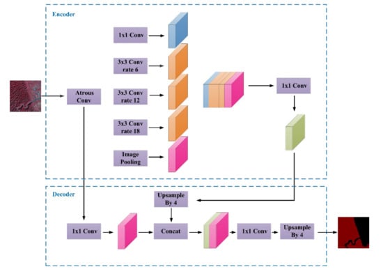 The used DeepLab V3+ network architecture is shown in Figure 6, which has the same kernel function size, stride, activation function of the convolutional layer, pooling layer, and deconvolution layer as the one proposed by Chen et al. [].