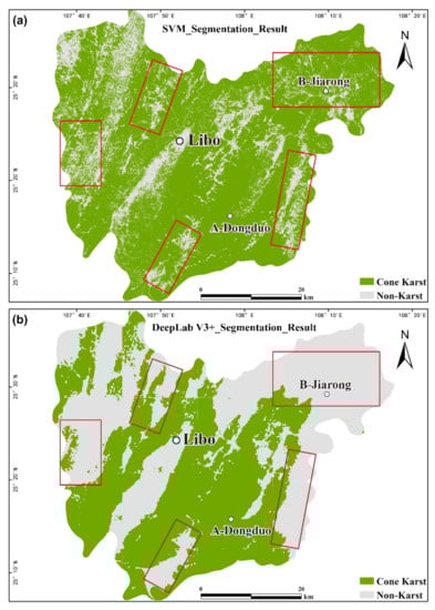 Segmentation results of cone karst in Libo using (a) SVM model and (b) DeepLab V3+ model.