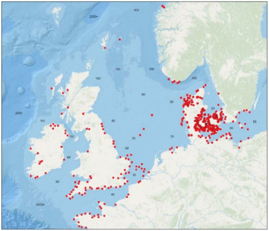 Recorded submerged Stone Age sites in northwest Europe. Depths given in meters. After Bailey et al. [36]. Graphic: Grøn.