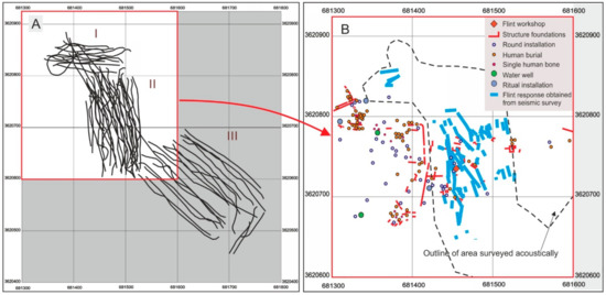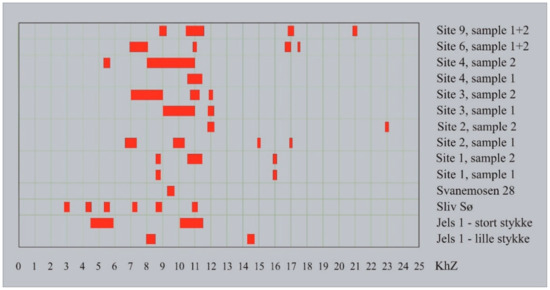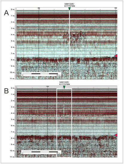 During a seismic (chirp) survey undertaken by Grøn in 1996, a number of profiles were recorded at the Møllegabet site [56]. One reason for doing this was to test the idea that the chirp could excite an acoustic response from the site’s large quantity of knapped flint. As the dwelling area and the boat grave had by then been excavated in total, and most of the knapped lithic material had therefore been removed, the shell midden, of which only minor parts had been excavated, was chosen as the main target for this exercise. Two zones then yielded such strong, significant and clear acoustic responses (Figure 10) that these were interpreted at that time as being due to a technical problem or noise created by the shells in the midden. Only following recognition of the haystacks at Atlit Yam (Figure 8) and the experimental work undertaken off Amager (Figure 7), nearly 20 years later, were they identified as being due to acoustic resonance from knapped lithics, which were known to be abundant in the excavated parts of the same shell midden.