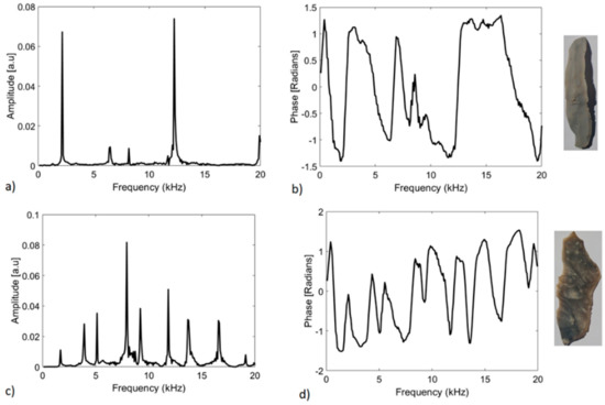 Figure 6 presents the magnitude and the phase as a function of frequency, obtained after measuring Sample 1 (top figures) and Sample 2 (bottom figures). The resonance frequencies (peaks) for Sample 1 are evident in Figure 6a: Below 20 kHz, there are five resonance frequencies, measured at 2.178, 6.494, 8.172, 12.25 and 19.92 kHz. The damping ratio was calculated using the 3-dB technique applied to the fundamental frequency and found to be 0.0053. The peaks are not equidistant and do not follow a regular pattern. This is primarily due to the complex shape of the flint blade, its curvature and possible internal heterogeneity. The phase for this flint blade was obtained using the Hilbert function and is shown in Figure 6b. There is π-change of the phase at the resonance frequencies. Both the magnitude and phase results should be used to detect resonance frequencies of the studied structure, as not all the peaks are due to the flint blade’s vibrations. It is the π-change of the phase that confirms whether a peak is at a resonance frequency. Figure 6c depicts the magnitude result for Sample 2. In the range of frequencies measured, nine resonance frequencies were observed at 1.698, 3.936, 5.135, 7.932, 9.211, 11.85, 13.77, 16.56 and 19.12 kHz. This flint blade is relatively flat but is less homogenous than Sample 1. The damping ratio was also calculated for this blade and found to be 0.0088. Figure 6d corresponds to the phase for Sample 2. The new measuring method demonstrates that knapped flint pieces have lower resonance frequencies than those hitherto identified. This is interesting from a detection point of view as lower frequencies exhibit better penetration than higher ones and thereby permit detection of worked pieces deeper in the seafloor sediments.