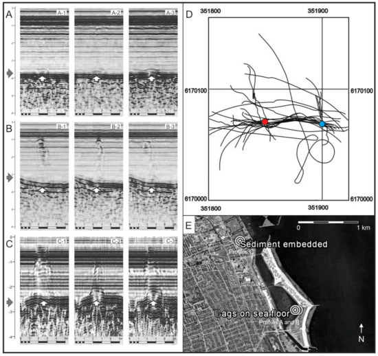 (A–C) Acoustic profiles recorded during resonance experiments. The grey arrows in panels (A–C) indicates the level of the seafloor. Cloth bags containing naturally cracked flint pieces (A), knapped flint pieces (B) and a bucket containing sand with embedded knapped flint pieces (C) are marked with white arrows and can be discerned on the seafloor. (A1–A3) Experiment 1: 14 kg of naturally cracked flint in a cloth bag. No flint response is evident in the water column. (B1–B3) Experiment 2: 14 kg of knapped flint in a cloth bag. A clear acoustic flint response can be observed in the water column. (C1–C3) Experiment 3: 14 kg of knapped flint embedded in sediment in a plastic bucket. A clear acoustic flint response is evident in the water column. (D) The sailing lines for experiments 1 and 2. The blue dot marks the bag containing human-knapped flint debitage and the red dot marks naturally cracked flint. (E) Location of experiments in the southern part of the lagoon of Amager Strandpark, Denmark. Experiment 3 was located in Sundby Sailing Union’s small harbour, north of the lagoon [41]. Zone 33 UTM coordinates. Graphic: Grøn.