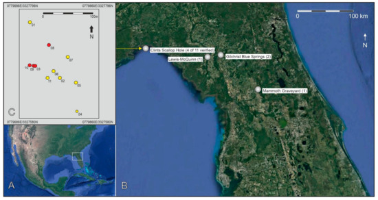 - Smith, M.F. Hunting an Underwater Mammoth: A Re-Evaluation of the First Submerged Prehistoric Site Excavated in the Americas. In New Directions in the Search for the First Floridians; Thulman, D.K., Garrison, E., Eds.; University Press of Florida: Gainesville, FL, USA, 2019; pp. 79–98. [Google Scholar]