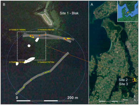 (A): The three already recorded Late Mesolithic sites in Roskilde Fjord, site 1 (401257-3), site 2 (401257-56), and site 3 (401257-57), selected for testing of acoustic response. (B): Especially site 1, the ‘Blak’ site, is interesting because it is well-documented by intensive investigations, including an excavation based on a 100 × 100 m recording area (white broken square). Preserved cultural deposits (white patches) and numerous cultural indicators were recorded inside and around the recording area. Each of the three sailing lines, and their recorded noise columns, are shown with an individual grey shade and a specific dot colour. The size of the dots is equivalent to their estimated significance. The estimated outline of the site is marked with as a broken blue circle. Zone 33 UTM coordinates. Graphics: Grøn.