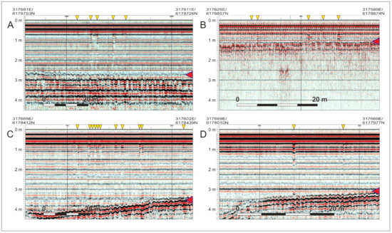 In 2020, Boldreel undertook chirp recordings at three already known and precisely positioned Late Mesolithic sites in Roskilde Fjord (Figure 13). All of these produced observable acoustic responses (Figure 14A–D). Site 1, the ‘Blak’ site (401257-3), is a 1.5–4 m-deep settlement of the Kongemose culture, a part of which was investigated intensively by S. Sørensen in 1989–93, based on a 100 × 100 m recording area [61,62]. His work included recording of preserved cultural deposits in four areas within and outside the recording area (Figure 13B). Two excavations were carried out inside the recording area. At the northern Blak I site, approximately 10 m2 of material from the late Villingebæk phase of the Kongemose culture at a depth of 1.5–2 m was excavated and dated to 8130–7640 calBP (6180–5690 calBC). At the southern type site for the early Blak phase of the Kongemose culture, Blak II, at a depth of 3.4–3.9 m, an area of 137 m2 was excavated and remains dated to approximately 8370–8150/8050 calBP (6420–6200/6100 calBC). The excavations produced a moderate amount of lithic material with a representative typological variability, concentrations of dumped burnt stones and some bone artefacts, as well as a bone assemblage reflecting marine fishing and terrestrial hunting, which was associated with remains of heavily charcoal-stained cultural deposits. A detailed geological investigation, including the analysis of a several cores, was carried out by Roskilde University on the site during the 1990 excavation campaign [61,62,63].