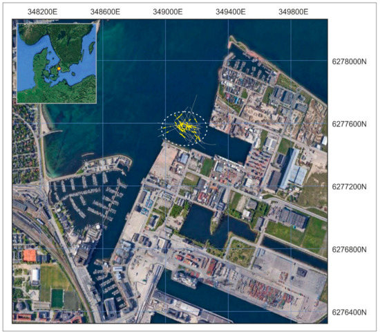 Map of the acoustic anomaly in Svanemøllen Harbour, Copenhagen, Denmark. The sailing lines are grey, the response features (haystacks and narrow noise columns) are yellow. Zone 33 UTM coordinates. Graphics: Grøn.