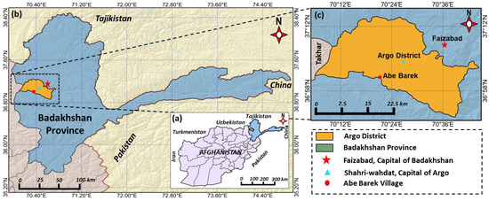 Location of the study area. (a) Afghanistan, study area, and borders with neighboring countries, (b) Badakhshan province, (c) Argo district, and Abe Barek village.