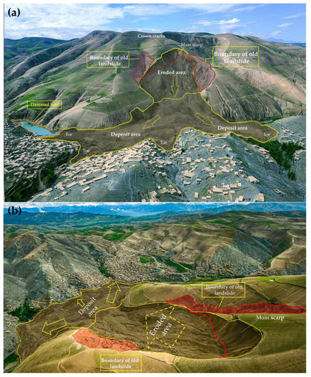 Collapsed area. (a) Front view of the Abe Barek landslide area, the yellow outlines indicate the boundary line on the current landslide, the red outlines represent the boundary of old landslides, and the photograph was taken on 5 May 2014 by [25]. (b) Top view of the landslide area shows how steep the slope is, the red outlines reflect the boundaries of the old landslides, the photograph was taken on 5 May 2014 by [25].