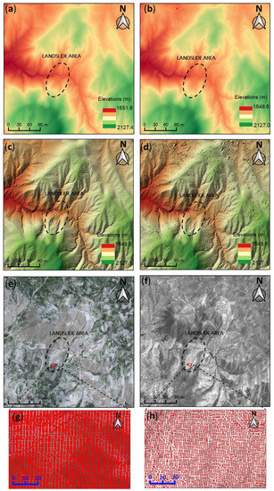 Data used in this study. (a) Generated 1 m-resolution pre-event DEM from the GeoEye-1 Satellite in June 2012; (b,c) pre-and post-event hillshades effects to the DEMs overlay with colors showing clear details of the study area; (d) generated 1 m-resolution post-event DEM from the IKONOS-1 Satellite in July 2014; (e) pre-event orthorectified multispectral image derived from GeoEye-1 images (0.5 m-resolution); (f) post-event orthorectified panchromatic image derived from IKONOS-1 images (0.8 m-resolution); close-up view of the generated point clouds of pre-event data (g) and post-event data (h) presents the rectangular area shown in (e,f).