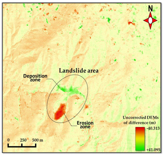 In order to quantify landslide volumes from DoD, the geometries of the obtained DEMs need to be registered accurately. However, the DEMs errors of height values are found in many cases, even when the data is geometrically registered. Previous studies revealed that the uncertainty, including registration-noise or locational errors in multi-temporal DEMs, would cause the miscalculation of soil volumes [14,15]. These errors arise from many factors such as the quality of original data, interpolation algorithm, projection method during the DEM creation process, etc. [16]. The horizontal misregistration between DEMs would be one of the major causes of the uncertainty in the DoD analysis.