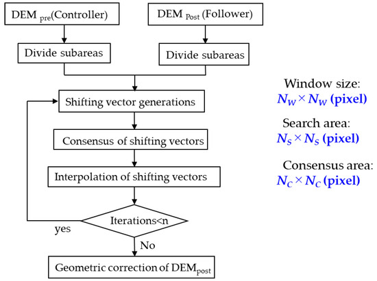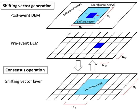 The flowchart of the nonlinear mapping technique for pre-and post-event DEMs is presented in Figure 6. This method consists of four operations: Shifting vector generation in subareas, consensus operations for shifting vectors, interpolation of consented shifting vectors, and the repetition of three previous operations until a satisfactory outcome has been achieved. In this analysis, the pre-and post-event DEMs are defined as the controller (reference) data and follower data, respectively. First, both DEMs are divided into subareas with the window size of NW-by-NW pixels (Figure 7). The segmented subarea (NW × NW pixels) in the follower data looks for the best-matched segment in the given segment’s neighborhood (NS pixels for left, right, upward, and downward) in the corresponding controller data by adopting the smallest elevations’ difference using the following formula: