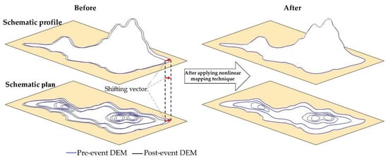 An adaptive nonlinear mapping method was introduced by Kosugi et al. [33] and Nakamura et al. [34] to superpose a pair of aerial or satellite images accurately and detect pixel-by-pixel changes automatically. The method can geometrically correct the images even if rotational gaps and local skews are obtained in the images. The method was applied not only to aerial images but also to LiDAR-derived DEMs by one of the authors for quantifying volumes of debris flows [21]. Hence, we applied this technique to the obtained DEMs in this study.
