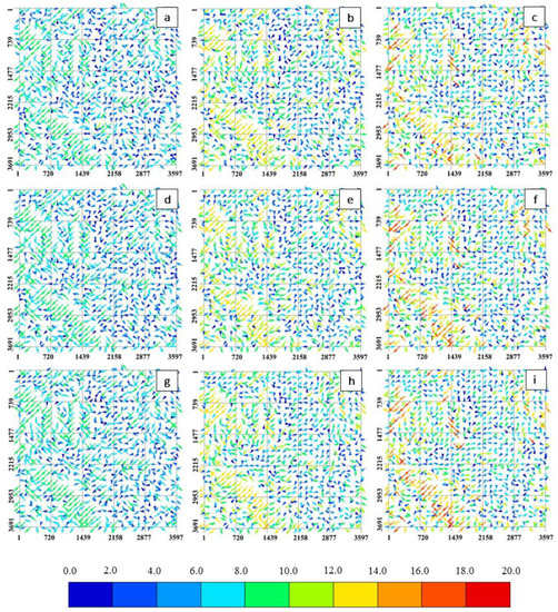 Figure 11a–i illustrate the generated shifting vectors for the scenario numbers 2–10 of Table 2. The selected test area of the pre-event DEM based on the entry-parameters described above looked for the best matching segment in the vicinity of the corresponding reference point in the chosen test area of the post-event DEM. As shown in Figure 11, shifting vectors were generated if the best matching point is not the same as the reference point. During the operation analysis, more than nine profiles of shifting vectors have been generated. Here, in Figure 11, nine of them have been shown. A moderate vector movement that brings reasonable smoothness in the DEMs quality and considerably removes the locational errors in the unaffected area compared to another set of shifting vectors would be chosen from all the generated shifting vectors. After the comparison, in Figure 11, we selected the shifting vector with label c. which corresponds to the parametric combination (NW = 5, NS = 9, NC = 3, n = 3). Since the shifting of the vectors in the selected parameters is smaller than the other shifting vectors (e.g., scenario number five to ten in Table 2 shown by Figure 11d–i), the corrected DEM eliminated the locational errors in the unaffected area significantly compared to the other shifting vector-related DEMs. Moreover, the selected shifting vector had the smallest mean, deviation, and sum of squares, as discussed and shown in Table 2.
