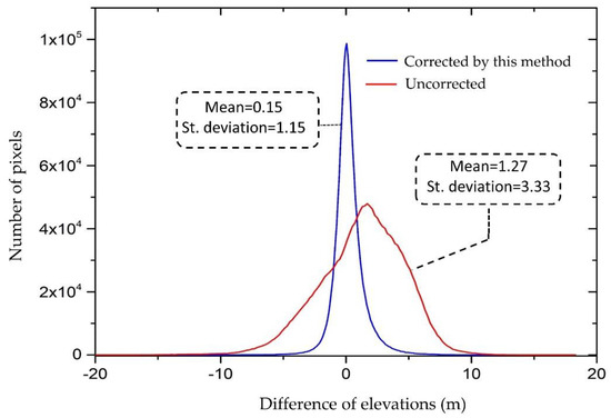 The histogram is a very handy way of graphically displaying the information contained in a single band of remotely sensed images [36]. In remote sensing, scientists usually examine histograms for each band to determine the quality of satellite images. The histogram presents the information by which one can figure out the quality of image data. In most cases, scientists show the before and after histogram graphs to compare the effectiveness of their image enhancement methods [37]. Hence, we compared the distribution of the difference of elevations in the corrected DEM with the uncorrected DEM using histograms.
