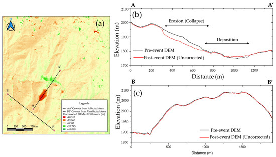 (a) Uncorrected DoD with the A-A’ and B-B’ cross-section lines. (b) Profile cross-section line (A-A’) passing through the affected area. (c) Profile cross-section line (B-B’) passing through the unaffected area.