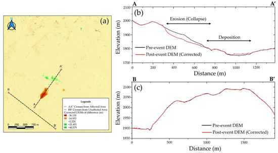 (a) Corrected DoD with the A-A’ and B-B’ cross-section lines. (b) Profile cross-section line (A-A’) passing through the affected area. (c) Profile cross-section line (B-B’) passing through the unaffected areas.