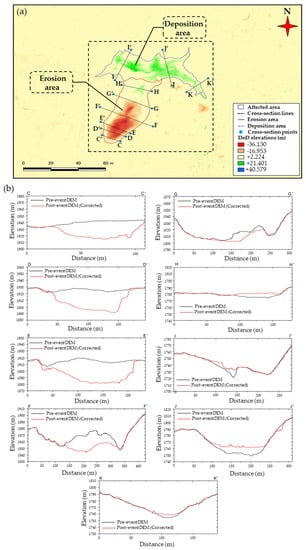 (a) DoD map obtained from the corrected DEMs presents the delineation of the landslide affected area and cross-section lines. (b) Cross-section profiles present the pre-and post-event surface difference throughout the landslide area.