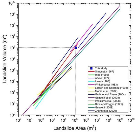 Comparison of the estimated landslide volume from our study with the empirical relationships linking the landslide area (AL) and volume (VL).