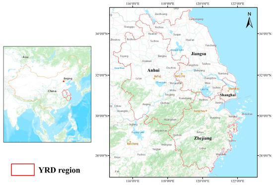 The Yangtze River Delta (YRD) is located along the alluvial plain before the Yangtze River enters the sea. The YRD includes Shanghai city, Jiangsu province, Zhejiang Province, and Anhui Province, with a total area of 348,000 km2 (Figure 1). The YRD has a subtropical monsoon climate, with an average yearly temperature of approximately 14–18 °C, and an average yearly rainfall of approximately 1000–1400 mm [27]. This area is dominated by plains, mainly distributed to the north and east of the YRD. Mountains and hills are mainly distributed to the southwest of the YRD. Affected by topography and climate, the YRD has strong landscape heterogeneity [28].