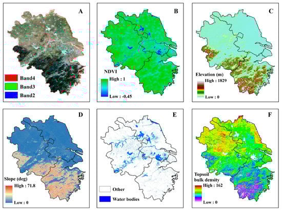 Datasets used in the study: (A) Median of the 2015 Landsat 8 Operational Land Imager (OLI) (4/3/2 bands), (B) Max Normalized Difference Vegetation Index (NDVI), (C,D) Shuttle Radar Topography Mission (SRTM) Digital Elevation Data, (E) European Commission’s Joint Research Centre (JRC) Yearly Water Classification History, and (F) OpenLandMap SoilGrids.