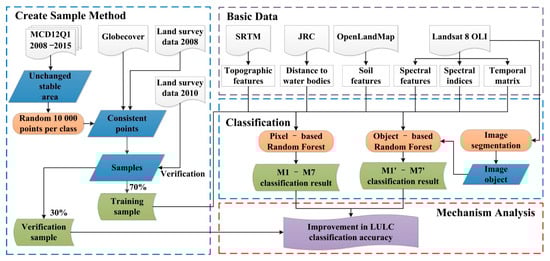 Figure 3 illustrates the overall process of this experiment. First, with the support of multi-source LULC products, following the principles of “stable state” and “consistent classification” [9], the reference data were generated and then divided into independent training and verification samples. We then segmented the pre-processed Landsat-8 OLI image, generated image objects, and obtained the feature value of each object. Third, we tested the performance and validated the classification accuracy of 14 classification models, including seven pixel-based methods and seven object-based methods. We then assessed the importance of different feature types for these models.