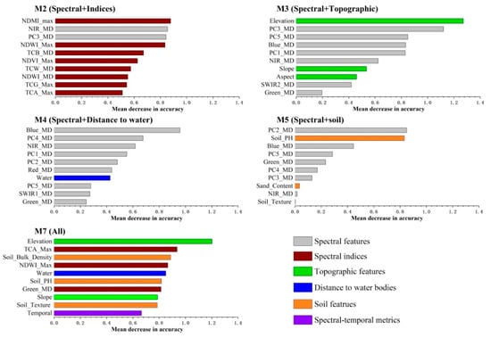 Different from M2, the remote sensing index in the M2’ model only included the median of the TCB (4th), the median of the TCW (7th), the maximum value of the NBR (8th), and the maximum value of the TCG (10th). Similar to M3, the median elevation was also considered the most important feature in M3’ while the median slope and aspect were respectively the 5th and 4th most important features. The difference between M4 and M4’ was that the distance to the water source was considered the most important in M4’. Similar to M5, the median of the topsoil pH (1st), the median of the soil texture class (5th), and the median of the topsoil sand content (9th) were in the top ten for M5′. Finally, in M7’, the auxiliary features dominated the top ten. Among them, the maximum of the TCA was the most important while the elevation was only the 4th most important.