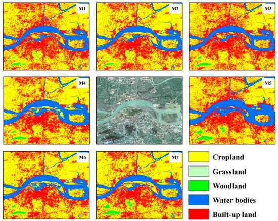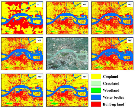 Comparison of the object-based classification results in a typical region. M1’–M7’ indicate the classification results of the seven object-based models listed in Table 3, respectively. The central subfigure is Landsat 8 OLI true color image.