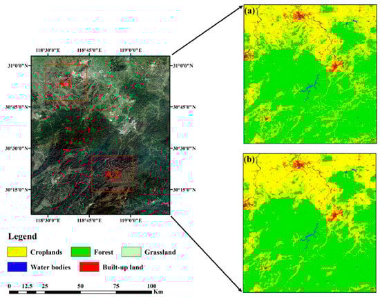 Detailed land use/land cover (LULC) information at global and regional scales is essential in many applications, such as natural resource protection, sustainable development, and climate change [1,2,3]. Remote sensing data are widely used to obtain LULC information [4]. However, for large areas with spatial heterogeneity, achieving high accuracy in LULC classifications with only satellite data is difficult [5]. With the availability of other auxiliary datasets, researchers have attempted to improve the accuracy of LULC classification by combining satellite data and auxiliary datasets [6].