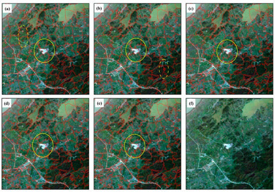 Image segmentation results for different spectral standard deviations in a typical area. The spectral standard deviations are (a) 0.15, (b) 0.20, (c) 0.25, (d) 0.30, and (e) 0.35. (f) The Landsat-8 OLI true color composite.