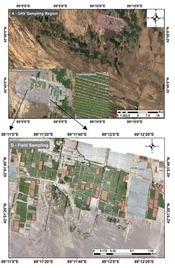 The top image area A covered by a light red mask shows the unmanned aerial vehicle (UAV) sampling region in Gaochang zone of Turpan, and area B shows RGB mosaics over a Sentinel-2A tile, and C is a 6-cm spatial resolution image acquired on 16 May 2019. Multispectral images were acquired on the same day and covered the same area. The bottom image area covered by a light red mask shows the locations of the observed field plots.