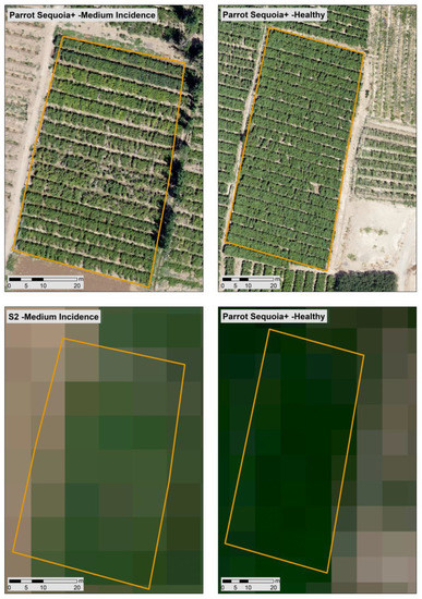 Example of vineyards with different pests and diseases incidences viewed by a high-resolution RGB camera and Sentinel-2. (Left) panels show medium incidence, and (right) panels show a healthy vineyard.