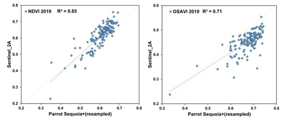 Meanwhile, the ability of UAV data to be used as field data was tested using field samples and spectral analysis. Previous studies showed that the spectral band of Parrot Sequoia+ was very similar to that of ASD [45]. Therefore, this study tested the correlation between VIs derived from Sentinel-2 and Parrot Sequoia+ and compared the results with the appearance of the high-resolution UAV and Sentinel-2 images.