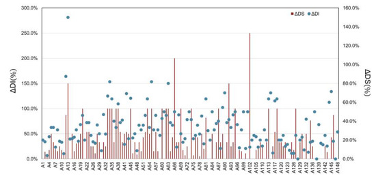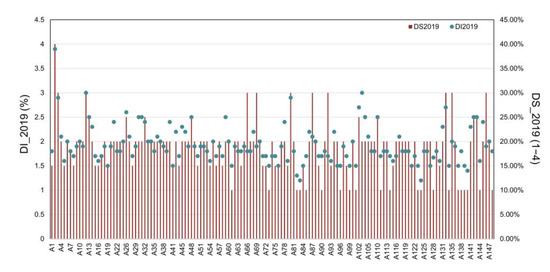 In addition, the potential of UAV sampling data to monitor vineyards was assessed on two scales: the relationship between temporal DI trends and the rate of change in vegetation indices was examined, and DI was related to VIs in 2019. All DI and DS were derived from images acquired by Parrot Sequoia+ in July 2018 and May 2019 from the surveyed vineyards (Figure 7 and Figure 8). The correlation between DS and DI was significant (r2 = 0.728, p < 0.001), as well as that between temporal change rates ∆DS and ∆DI (r2 = 0.489, p < 0.001). Vineyards affected by pests show different rates of change in incidence and severity, and vineyards that had already been affected lightly in 2018 showed an obvious increase in 2019 (e.g., A66 and A102).