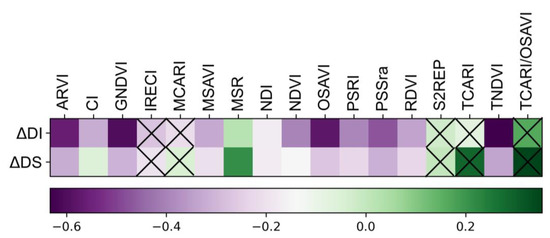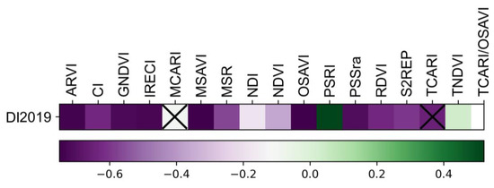 Relationship between DI2019 and vegetation indexes (VIs). The range co-domain of the correlation coefficients is shown in the color bar. (X) symbols represent non-significant relationships (p ≥ 0.001).