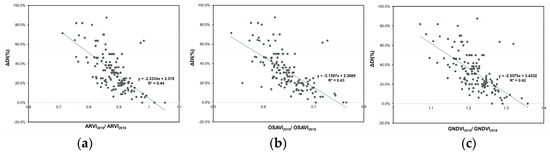 Relationship between ΔDI and temporal rate of change in VIs: ARVI (a), OSAVI (b), GNDVI (c).