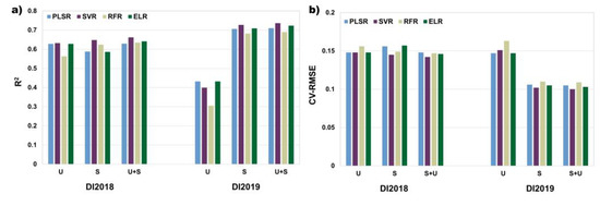 In addition, Figure 12 shows the comparison of DI2018 and DI2019 prediction results by PLSR, SVR, RFR, and ELR. R2 and CV-RMSE are presented in this figure to show the accuracy of the various models. Taken as a whole, the performance of SVR was superior to other models in this study with higher R2 and lower CV-RMSE.