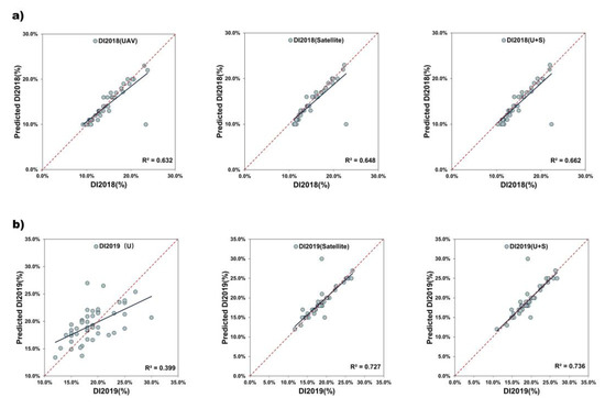 SVR yielded the best performance for predicting DI compared to other ML models (Figure 9). Therefore, it was used to generate a prediction of DI2018 based on various input features including UAV-derived information, satellite-based VIs, and the fusion of UAV with satellite-based features.