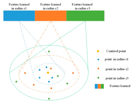 The PointNet++ network uses iterative FPS to choose a subset of points. Each local region in an output is abstracted by its centroid and local feature that encodes the centroid’s neighborhoods. However, when analyzing the learned information carefully, the feature learned on the centroid point may not contain relevant information, especially in large-scale neighborhood balls. The airborne point cloud density distribution is uneven, especially in the intersect band. Besides, sampling all points in neighborhood balls is not realistic as it wastes memory and is inefficient. This defect presents a challenge in setting the radius size in the PointNet++ network. Figure 1 demonstrates PointNet++ in which MSG is used on the features learned on the centroid points.