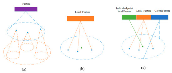 Feature learning with multi-resolution grouping (MRG) method. (a) Sketch of MRG, with each cone representing feature learning. (b) Feature learning in the original PointNet++. (c) Feature learning with proposed method.
