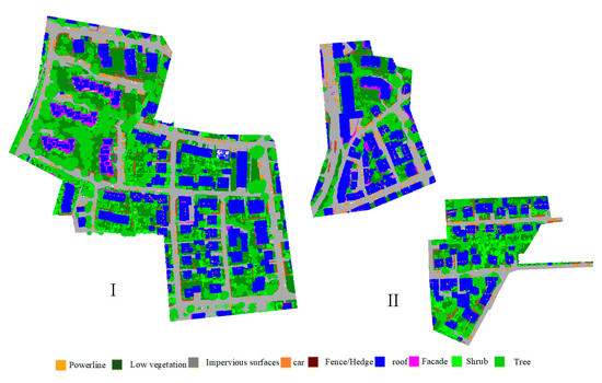 To evaluate the performance of the proposed method, we conduct experiments on two ALS datasets: the ISPRS benchmark dataset of Vaihingen [31], which is a city in Germany (Figure 4), and the GML(B) dataset. The ISPRS benchmark dataset’s point density is approximately 4–7 points/m2. As shown in Figure 4, it belongs to the cross-flight belt (the overlap in scene I is in the middle whilst the overlap in scene II is at both ends), thus indicating that the point in this dataset is uneven.