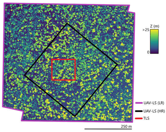We collected unique point cloud data sets at the study site comprised of one TLS and two UAV-LS (two resolutions) surveys (Table 1). We used TLS to create a benchmark data set to test our algorithms. The TLS data were collected with a Leica BLK360 scanner, which is a discrete single return scanner [26,27] operating at 830 nm with a beam divergence of 0.4 mrad. The one hectare plot was scanned following a grid pattern of 20 × 20 m, which resulted in 36 scan positions. The data set was within two weeks of a wildfire, resulting in minimal understorey occlusion. The UAV data sets (Figure 1) were collected with a RIEGL RiCOPTER equipped with a VUX-1UAV scanner (RIEGL Laser Measurement Systems GmbH, Horn, Austria, Figure 2). The UAV-LS data were acquired with a VUX-SYS scanner, operating at 1550 nm with a beam divergence of 0.5 mrad. The RIEGL VUX-SYS consists of the RIEGL VUX1-UAV laser scanner combined with an Applanix APX-20 IMU, which including the control box and wiring weighs approximately 7 kg. The RIEGL RiCOPTER eventually had a take-off weight of a 24.9 kg. The maximum flight time is 20 min, but due to the required in-flight dynamic alignment of the IMU, the effective mapping time was reduced to 15 min. Two flights were conducted. For flight planning, the UGCS-ground station software was used; however, during Flight 1, the autopilot failed, and the flight was continued manually. This resulted in a random pattern of crossing flight lines at an approximate speed of 3 m/s for Flight 1. With Flight 2, a larger area was covered, first following the outlines of a 500 × 500 m area and next crossing the study area 11 times with a flight speed of 5 m/s. The recorded flight lines are included in Appendix A, Figure A1. Flight 1 eventually covered an area of 98,000 m with an average point density of 1800 pts/m, while Flight 2 covered 340,000 m and resulted in a point density of 680 pts/m. Both flights were conducted at a height of 55 m above ground level. We will refer to LiDAR data from Flight 1 and Flight 2 as UAV-LS high resolution (HR) or low resolution (LR) data, respectively. The UAV-LS processing followed procedures as described by [24]. The collected raw data were processed using RiPROCESS, the VUX-1UAV accompanying software package. Initial trajectory estimation was based on post-processed kinematic (PPK) processing tools, using a local base station. This was further processed into global coordinates together with the systems GNSS data within POSPac Mobile Mapping Suite v8.3 (Applanix Corporation, Richmond Hill, ON, Canada).