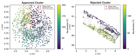The dip direction represents the direction of the slope. Since the termite mounds have a conical shape, this value should alter from 0 to 360 degrees around the centre of the mound. If the optimized centre is located > 0.75 m from the mean position of the cluster or if the RMSE of optimization > 1, the cluster is rejected. The grey lines are contour lines (height). In this figure, the approved cluster is a termite mound, while the rejected cluster is a fallen tree trunk. Taken from the UAV-LS (HR) data set.
