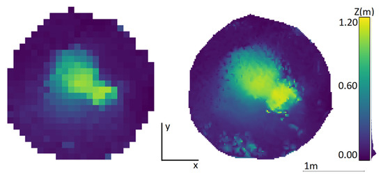 Alternatively, mound height can be estimated by a “grid approach” using the tool “rasterize” in CloudCompare (Figure 6). To estimate the height, the point cloud is rasterized (grid: 10 and 20 cm for UAV-LS (HR) and UAV-LS (LR)) using the z value of the lowest point in each grid cell, after which the height difference is calculated between the highest and lowest raster value. If a grid cell has no points, the adjacent cells are interpolated.