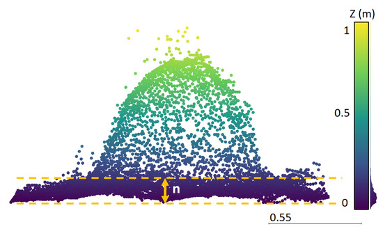 Because we wanted to use the most precise mound shape possible to calculate the volume, we used a “grid approach”. We therefore used, as with the TLS benchmark data set, a grid size of 2 cm to rasterize the termite mounds. Note that the grid size was significantly lower than for the height calculation, because we wanted to capture termite mound shape precisely. For the height calculation, a larger grid size was used to avoid the influence from outliers. Since the volume was calculated as the sum of many small cuboids, outliers had less influence. As for the TLS benchmark data set, the average z value of the points per grid cell was set as the raster value, and the volume was calculated as the sum of each cuboid volume. However, we vertically confined the cuboid in a different manner. For the TLS data set, the cuboid was vertically confined by the raster value and the lowest point. For the UAV-LS data, we confined the cuboids by the raster value and the mean of the 20 lowest points of the termite mound plus an optimized value n (Figure 7). The extra value n was added to prevent overestimations of termite mound volume and included points that were part of the ground surface. This value was optimized by minimizing the least squared error between the calculated volume of the UAV-LS mounds and the benchmark data set. We chose the mean value of 20 lowest points instead of the value of the lowest point to prevent the influence of an outlier, if present.