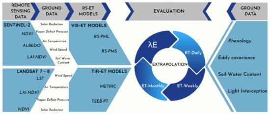 Data sources and their integration with Remote Sensing-based Evapotranspiration (ET) models (RS-ET models). NDVI = Normalized Differential Vegetation Index; LAI-NDVI = Leaf Area Index obtained by NDVI; LST = Land Surface Temperature; RS-PML: Remote Sensing Penman-Monteith–Leuning Model; RS-PMS = Remote Sensing Penman-Monteith–Stewart Model; METRIC = Mapping EvapoTranspiration with high Resolution and Internalized Calibration; TSEB-PT = Priestley–Taylor Two-Source Model; λE = Instantaneous Evapotranspiration; ET-Daily = Cumulative Daily Evapotranspiration; ET-Weekly = Cumulative Weekly Evapotranspiration; ET-Monthly = Cumulative Monthly Evapotranspiration.